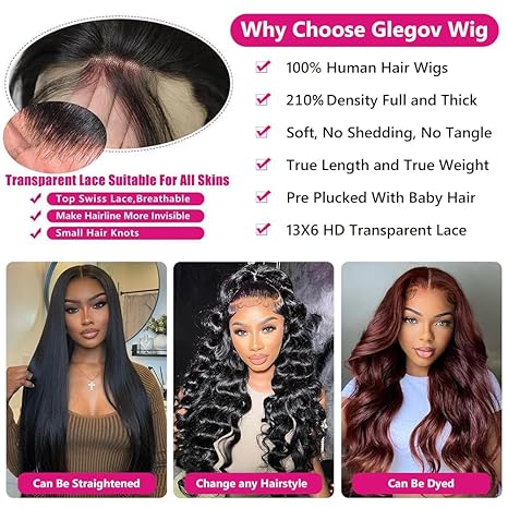 - 【13×6 Lace Front Wigs Human Hair Advantages】HD Lace Frontal Wigs Human Hair Uses Swiss Lace Which Is More Comfortable,Transparent,Invisible,Durable For Long Time Use,Match All Color Skins,210% Density, No Smell, Soft, Bouncy, Shedding Free, Tangles Free, True to Length, Full and Thick. Styled As You Like