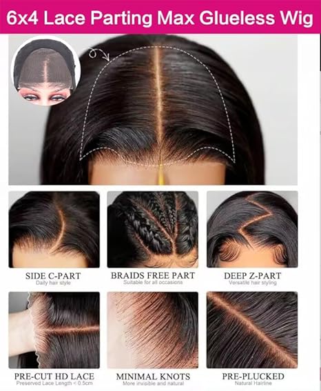- Glueless Wigs Lace: 6×4 Swiss HD Lace Pre Cut Glueless Wig Wear and Go, Pre-Plucked Natural Hairline, and Pre-Cut Lace by the Special Technical Scissor to Make Sure the Edge is Stronger and Neater.Newly Upgraded 6×4 Hd Swiss Lace Wig, More Lace Part Than Normal Closure, More Style Space.