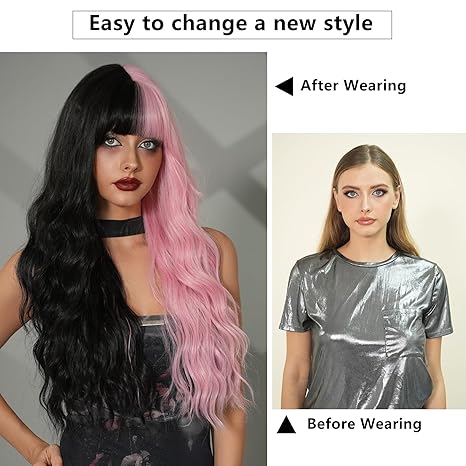 - ★We have a beautiful gift box packaging, A beautiful pair of false eyelashes is included as well as two hair nets and Hair Clips .The half black half pink ombre wig is made of 100% high-quality heat resistance synthetic fiber,140% high density imitating human hair, Suitable for all-day to wear it, If you’re receiving a long wavy bangs wig for the first time, there may be tangles. You can spray it with a watering can and comb it to soften the long wig again.