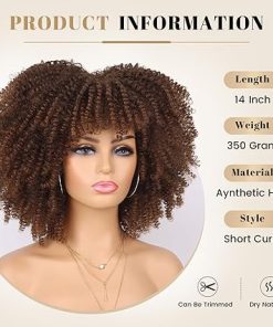Wig store-Curly-Afro Kinky Curly Wigs for Black Women Natural Looking Short Bob Wig with Bangs None Lace Front Wig Long Kinky Curly Synthetic Hair for Daily Party (Ombre Brown- 14 Inch)