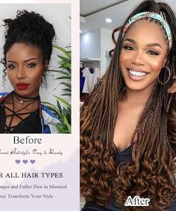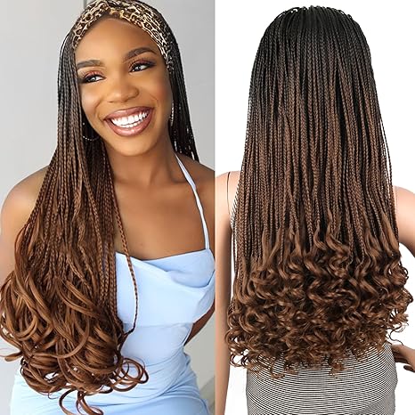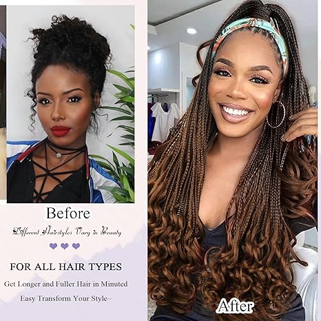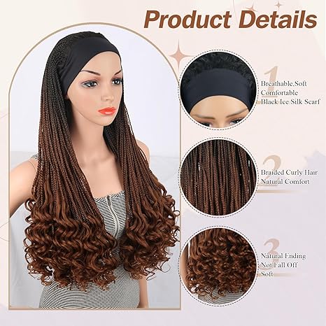 Wig store-Curly-Aisaide Headband Wig Ombre Brown Braided Wigs for Black Women Braided Headband Wig with Curly Ends Synthetic Dark Brown Box Braid Wig with Headband Attached Long Crochet Braids Curly Braiding Hair