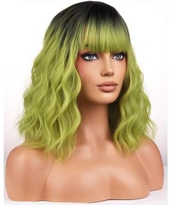 Wig store-Curly-BERON Green Ombre Womens Wig Short Curly Wavy Girls Hair Wigs with Bangs Dark Roots Color Wavy Hair Wigs 12” Women’s Synthetic Wig Daily Use