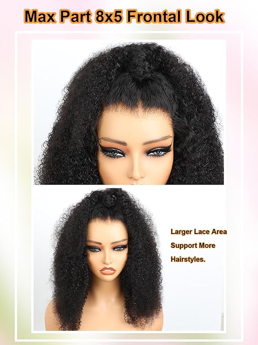 - Pre Plucked Bleached Knots 8×5 Lace Frontal:195% Density Afro Kinky Curly Human Hairs to Make Big Fluffy Beautiful Curl,Pre Cut Lace Wig,Full and Thick,Medium Size Cap and Pre-Cut HD Lace with Adjustable Straps,Removable Elastic Band and Combs in the Back,Match Head Perfectly,Soft,Healthy,No Smell,Tangle-free,Minimal Shedding
