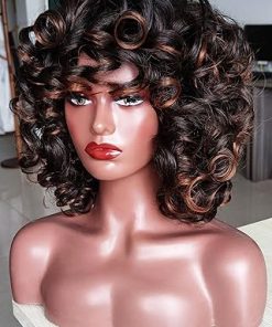 Wig store-Curly-ELIM Ombre Brown Short Afro Big Curly Wigs for Black Women with 7 PCS Accessories- Natural Looking Kinky Curly Bangs Wig Synthetic Hair Replacement Wig for Daily Party Use Z301BB