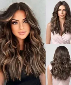 Wig store-Curly-HAIRCUBE Long Dark Brown with Highlights Wigs for Women Synthetic Curly Wavy Hair Wig