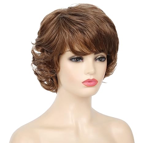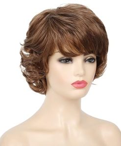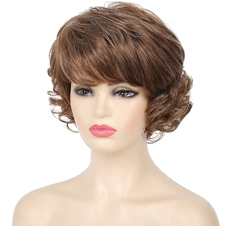 Wig store-Curly-Kaneles Short Brown Curly Hair Wig with Bangs for Women Natural Layered Synthetic Old Ladies Hair Heat Resistant Cosplay Full Wigs(Golden brown)