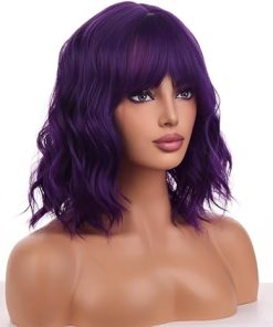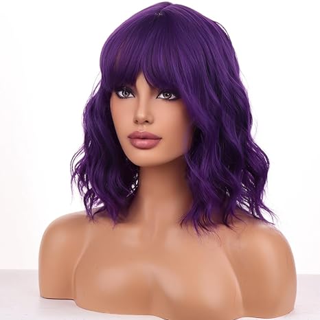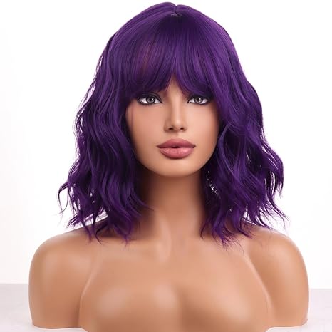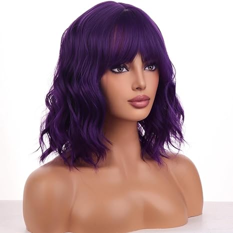 Wig store-Curly-Mixed Purple Wig Short Bob Wig Short Dark Purple Wigs for Women Purple Wig Curly Wavy Wig with Bangs Heat Resistant Synthetic Hair Wigs for Daily Use Cosplay Wig With Wig Cap