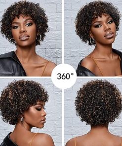 Wig store-Curly-Short Curly Wigs for Black Women Brazilian Virgin Human Hair Wigs for Middle Aged Black Women Black Mix Medium Brown Highlight Color 150% Density Regular Wig Machine Made Glueless Wig No Lace Wig