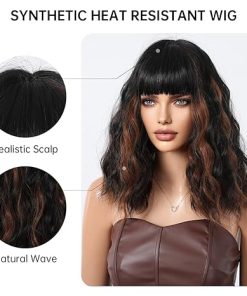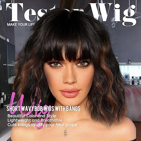 Wig store-Curly-testar Black Mixed Brown Wigs with Bangs Short Wavy Bob Wigs for White Women Short Curly Hair Synthetic Wigs for Daily Party Use 14IN