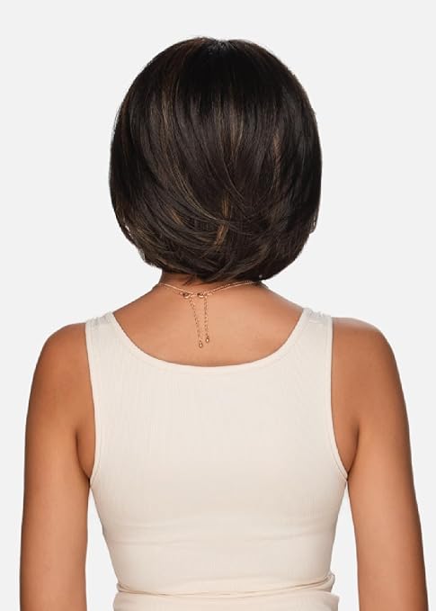 - 10″ Layered Feathered Bob with Bangs: The HMB-KATE wig from the Vivica Fox Hair Collection showcases a chic 10-layered feathered bob cut, complemented by delicately layered bangs for a soft, stylish look with added volume and movement.
