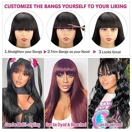 - 🎀🎄Hair Advantage:Machine Made Short Bob Wigs with Bangs,Comfortable and Breathable.No Tangles,No Shedding,No Lice,No Chemical Synthetic Hair,No Animal Hair.Every Procedure is Inspected by Worker.Soft and Healthy,No Smell,Can be Dyed and Permed as you like,Last for Long with Good Hair Care