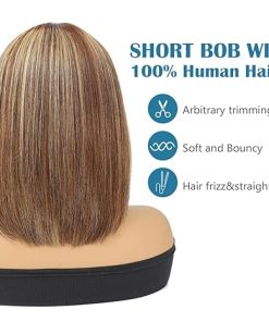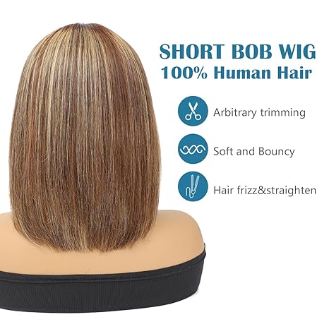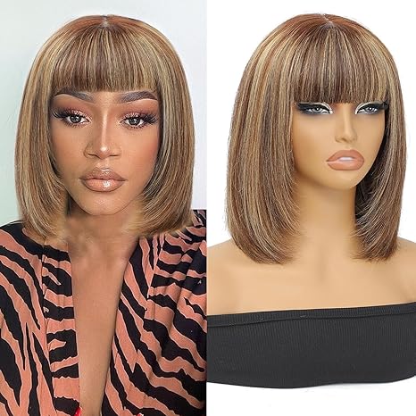 Wig store-Straight-10 Inch Bob Wig Human Hair Glueless-Highlight Straight Bob Wig with Bangs Human Hair for Daily Wear