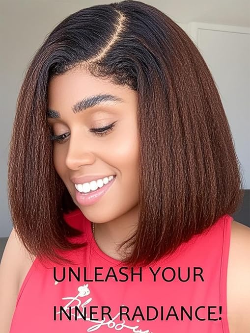 Wig store-Straight-4C Kinky Edges Lace Front Bob Wig Ombre Brown Short Kinky Straight Human Hair Wig Glueless Yaki Straight Blunt Cut Bob Wig with Natural Hairline For Women 14 Inch