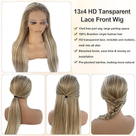 - 【Light Blonde Highlights 13×4 HD Lace Front Wigs Human Hair Material】No synthetic blends! 100% unprocessed 10A Brazilian virgin human hair lace front wigs, cut from healthy young female head directly, clean, soft and bouncy, no chemical process. Natural shiny human hair wig can be dyed, straightened, curled, and restyled, no smell.