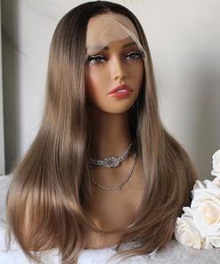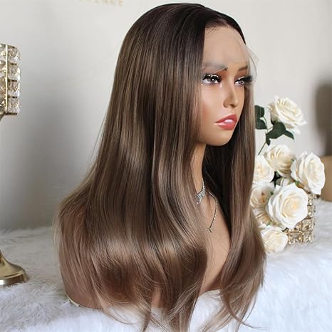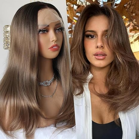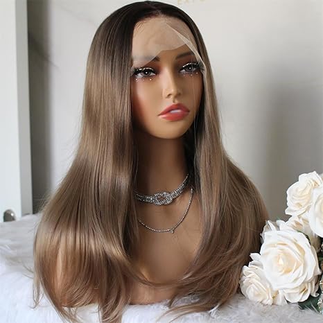 Wig store-Straight-Aisom Sandy Brown Natural Straight Synthetic Lace Front Wig for Women 13×4 Pre Plucked Glueless Ombre Wig with Dark Root for Daily Use Shoulder Length 18 Inch