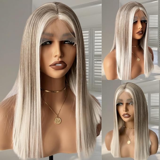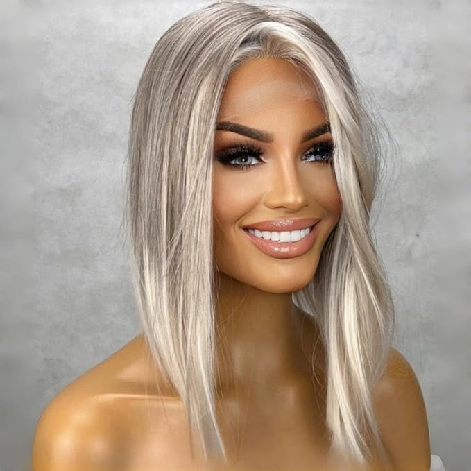 Wig store-Straight-Ash Blonde White Balayage Highlights Streaks Bob Lace Front Wigs Dark Grey Ombre Blonde Silky Straight Wig with Dark Roots HD Lace Frontal Japanese Synthetic Platinum Highlight Wigs for Women 16 Inch
