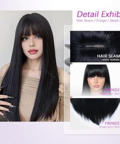 - Flawless Style with Bangs Achieve a chic black wig look with this long straight black wig with bangs. Whether for party, daily wear, or fashion shows, this wig’s sleek, natural style offers beauty and confidence for any mood or occasion.