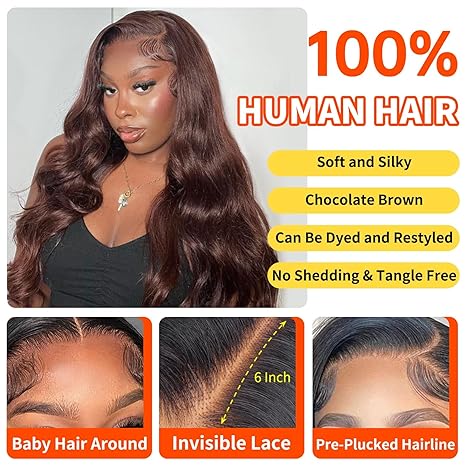- 【BALORIECA Chocolate Brown Body Wave Lace Front Wig Human Hair Material】Is Made of the Real Swiss Lace which is the most undetectable lace. Ultra-thin & Ultra-premium with seamless blending capabilities and melt into your skin perfectly no matter what’s your skin tone. Realize your hair grows from your scalp