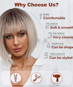 Wig store-Straight-EMMOR Omber Blonde Bob Wig with Bangs 12″ Short Bob Wigs for Women Short Blonde Wig with Dark Roots Heat Resistant Synthetic Wig Natural Looking for Daily Use Party and Cosplay(Ombre Ash Blonde)