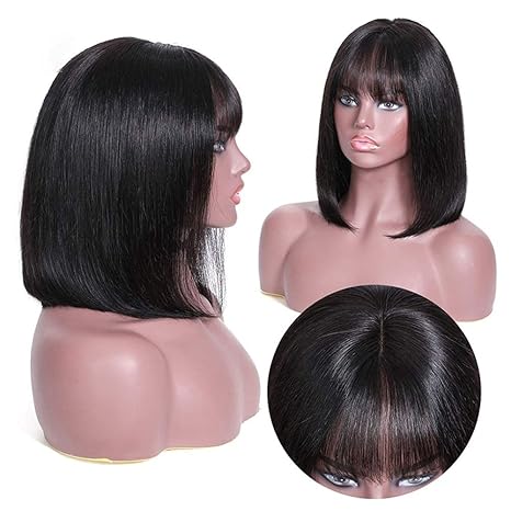 Wig store-Straight-Human Hair Bob Wig with Bang None Lace Front Wigs Machine Made Bob Wigs with Bangs for Black Women Natural Color 10 Inch