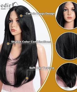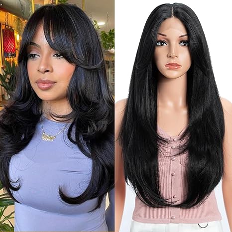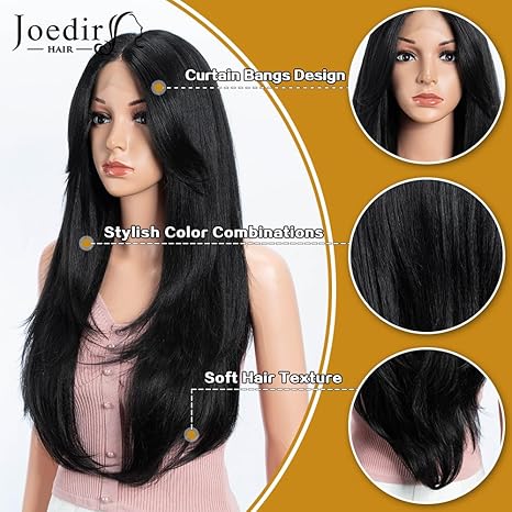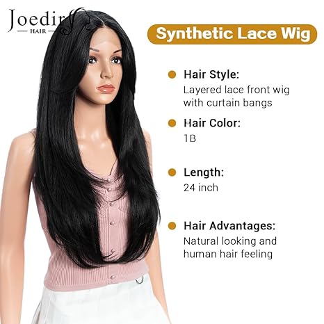 Wig store-Straight-Synthetic Lace Front Wig for Women Long Layered Hair Wig with Curtain Bangs 24 inch Long Straight Black Hair Wig for Daily Party Cosplay (Color:1B)