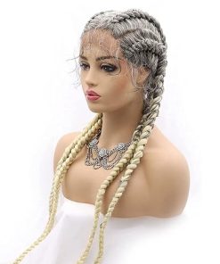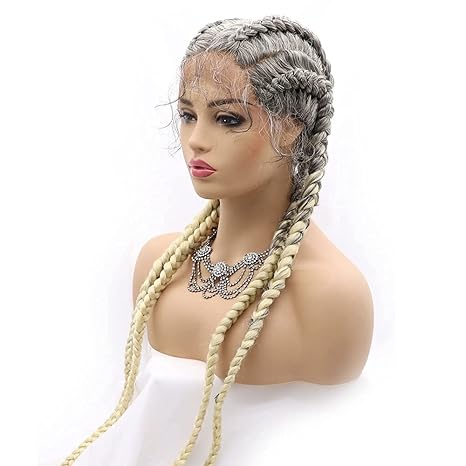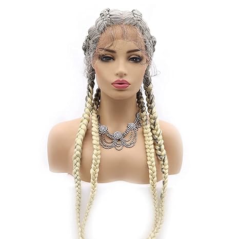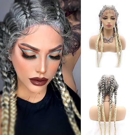 Wig store-Wavy-4 Braided Wigs Realistic Hand Braided hair Lace Front Wigs Ombre gray/Grey Mix Blonde 613 Synthetic Braided Wig with Baby Hair Real Lace Wig 30 Inch