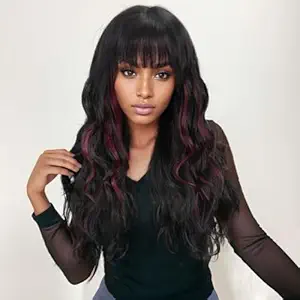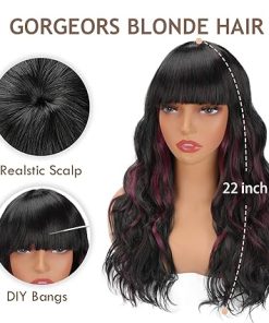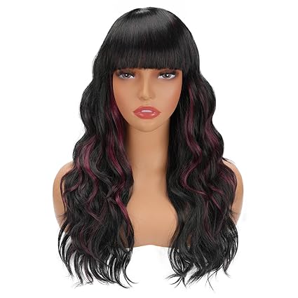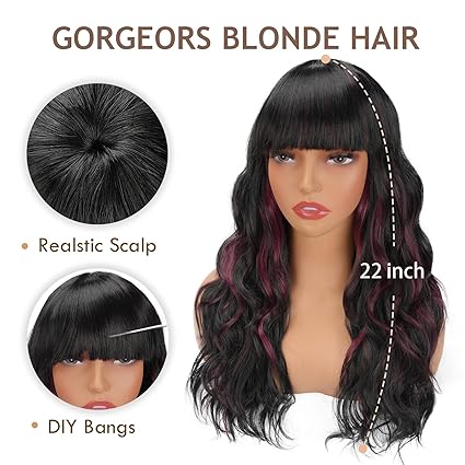 Wig store-Wavy-Black Wig with Burgundy Highlight Wig with Bangs Long Wavy Wigs for Women 22 Inch Wavy Curly Synthetic Wig Daily Party Cosplay Use