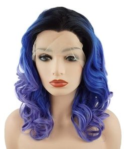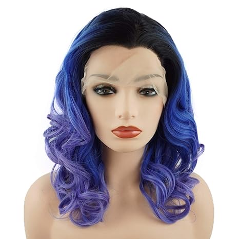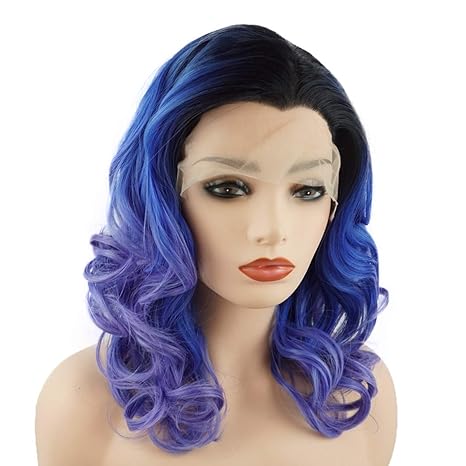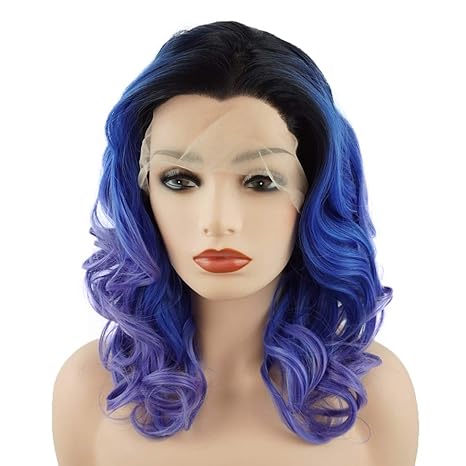 Wig store-Wavy-Hair Wavy Shoulder Length 16inch Dark Root Blue and Purple Mix Heavy Density Realistic Synthetic Lace Front Wig
