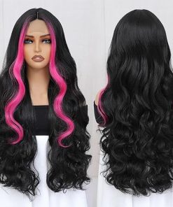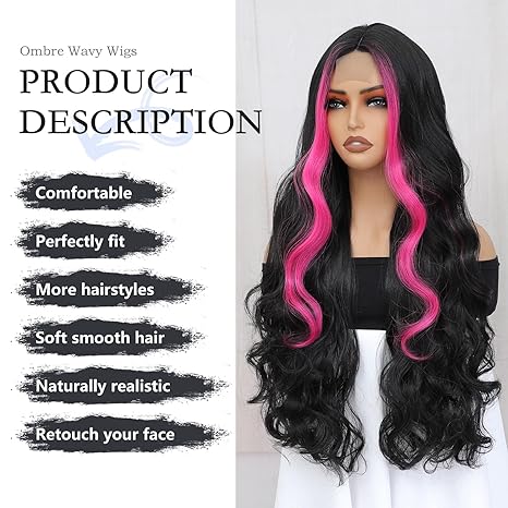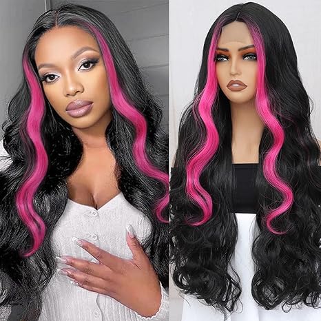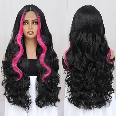 Wig store-Wavy-Long Wavy Highlight Wig 28 Inch Pink Highlights Synthetic Wigs for Women Middle Part Body Wave Lace Front Wig Natural Looking Fake Scalp Hair Replacement Wigs for Daily Party Use 1b/pink