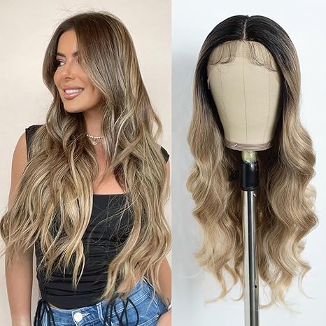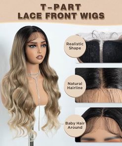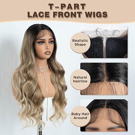 Wig store-Wavy-NOBLE Long Dirty Blonde Wavy Wig with Dark Roots T-Part Lace Front Wigs with Baby Hair 28 Inches Middle Part Wavy Wig Natural Looking Heat Resistant Fiber Wig for Daily Party Use