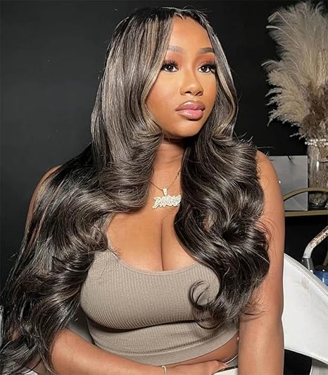 Wig store-Wavy-Upgrade Black with Brown Blonde Highlight Wig Human Hair 210% Density 13×4 HD Body Wave Luxury Balayage Blonde Highlight Wig 12A Grade Raw Hair Pre Plucked Ombre Lace Front Wig for Women 20 Inch